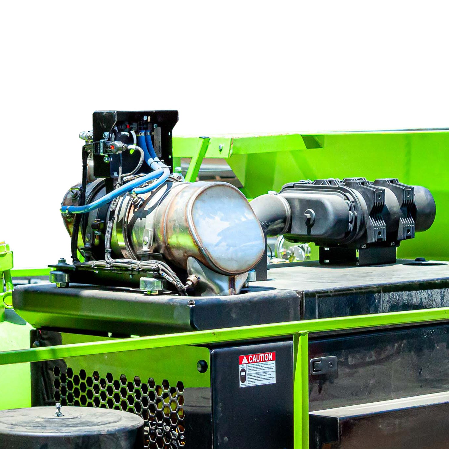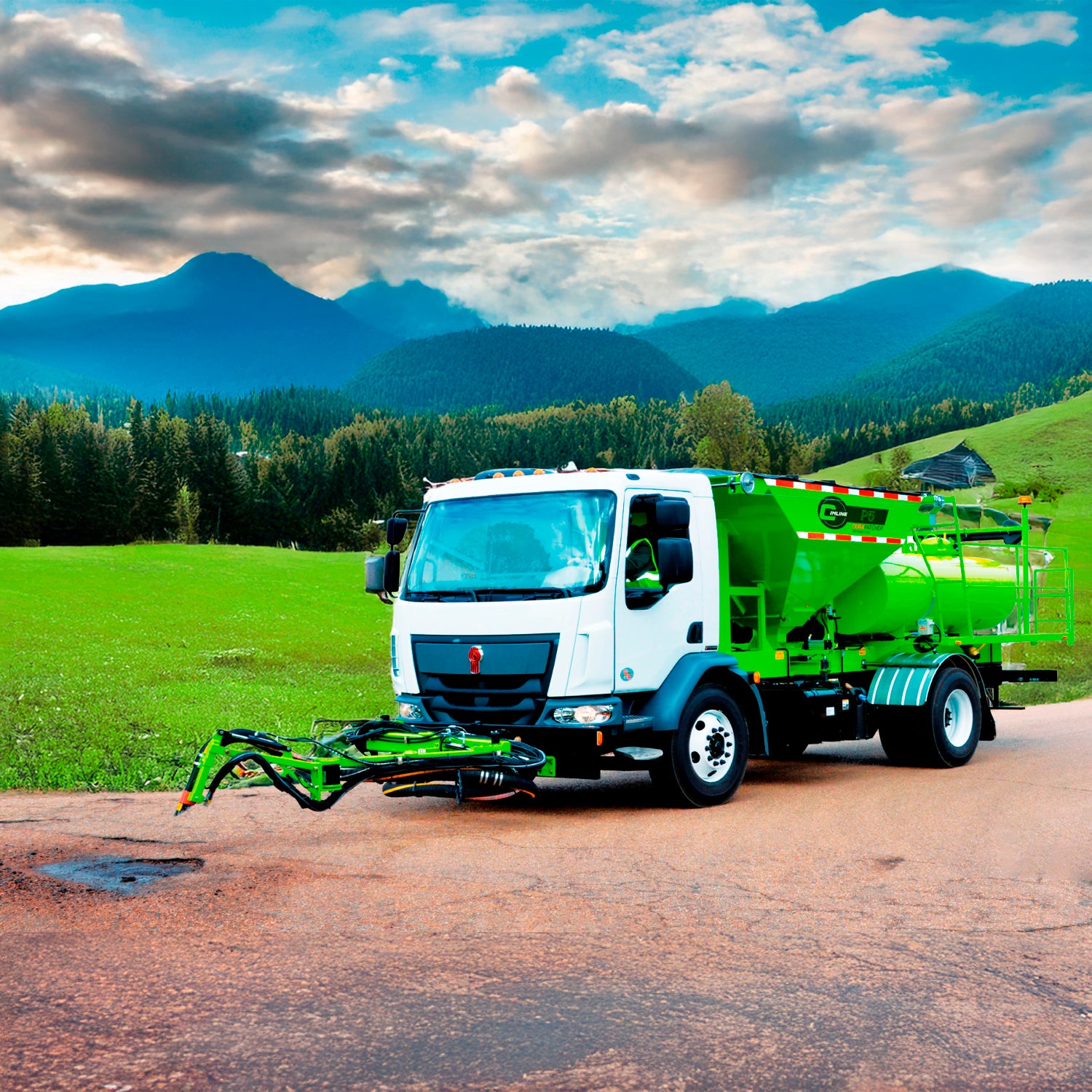 ALTA VISIBILIDAD Para mayor visibilidad y seguridad vial, todas las unidades DuraPatcher™ P5 están pintadas de verde brillante de alta visibilidad, cuentan con un amplio panel de flechas direccionales e incluyen luces estroboscópicas dobles en la cabina del camión y la parte trasera de la máquina. Mantener seguros al operador y a los conductores locales mientras el parcheador está trabajando es una razón clave por la que se creó el DuraPatcherTM P5.