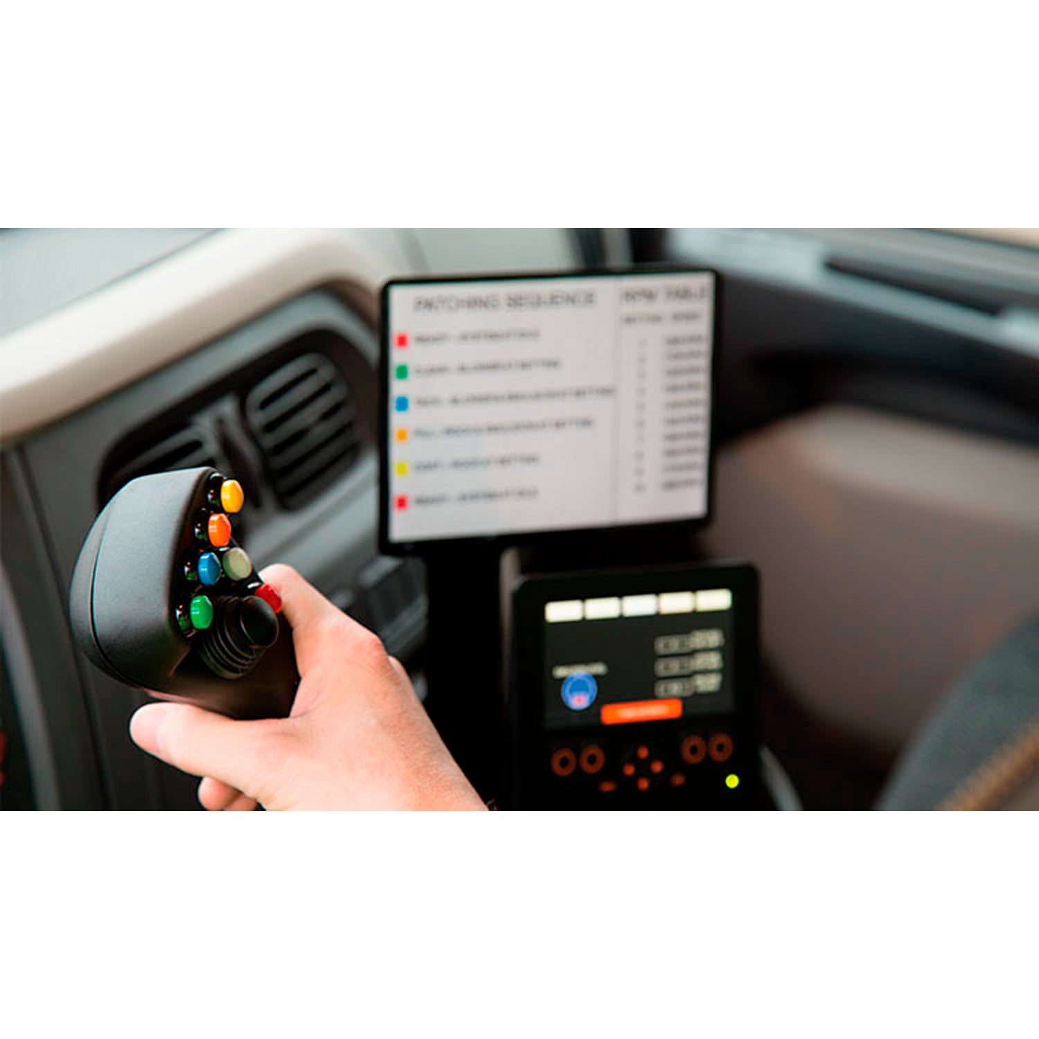 El joystick, con control para pulgar e índice, está fijado al asiento del operador, lo que proporciona total comodidad durante toda la jornada. La pantalla de estado está montada en el pilar de la ventana del lado del conductor, a la altura de los ojos, lo que permite al operador mantener la vista en alto y al tanto de la situación delante y alrededor del vehículo. La cabina no cuenta con otros componentes, lo que proporciona una excelente visibilidad y permite al operador concentrarse en el proceso de bacheo y en el entorno del vehículo. La pantalla mantiene informados a los operadores sobre su estado de aplicación, el nivel del tanque de emulsión y el número de bacheos realizados durante su turno.