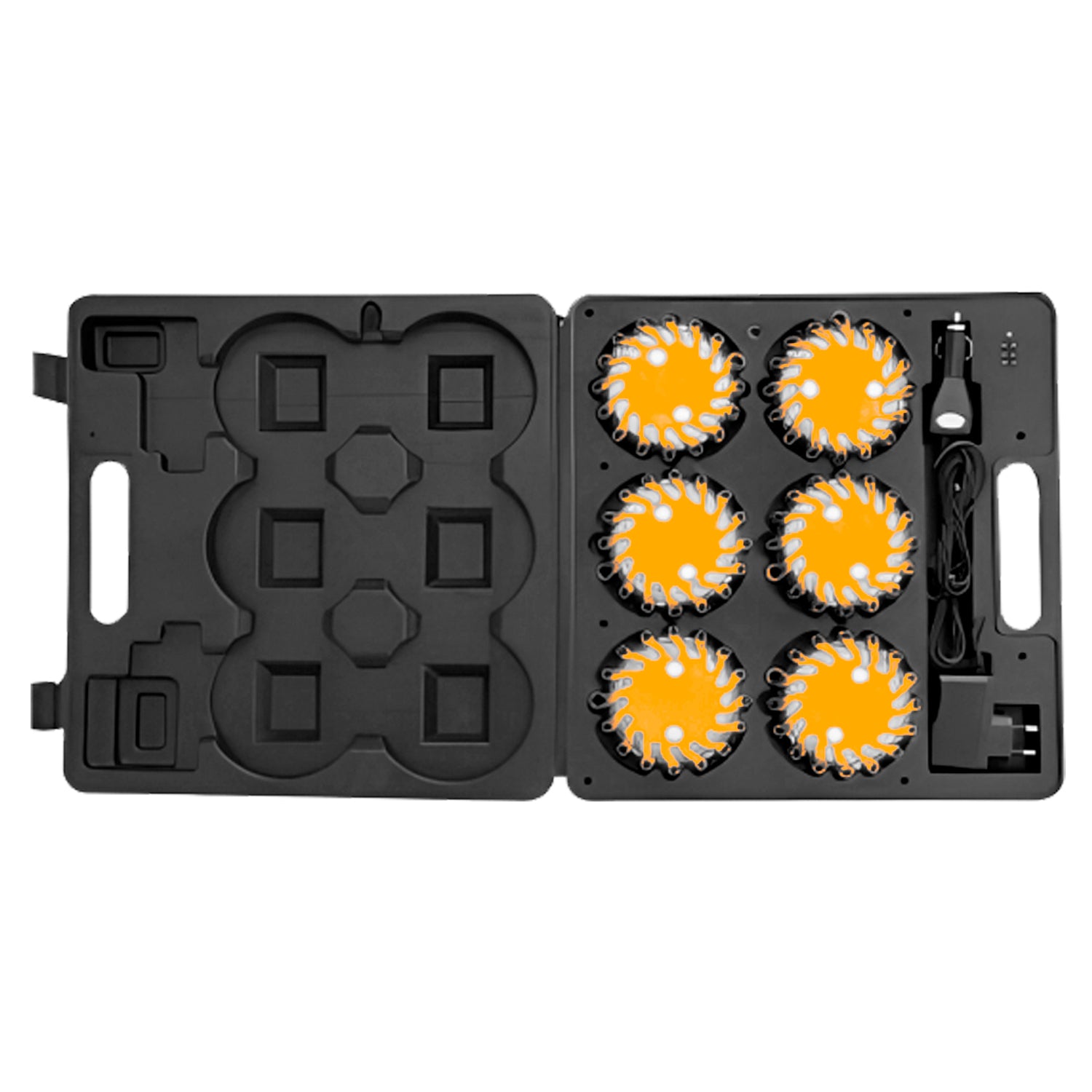 Resistente a golpes, al aplastamiento por vehículos, al congelamiento, poseen 9 posiciones de destelles, impermeable 100%, visible a 1 km, alta luminosidad y bajo consumo, orificio para colgar e imán para adherirse a metales, maletín con 6 balizas y un cargados para corriente alterna y para vehículo.