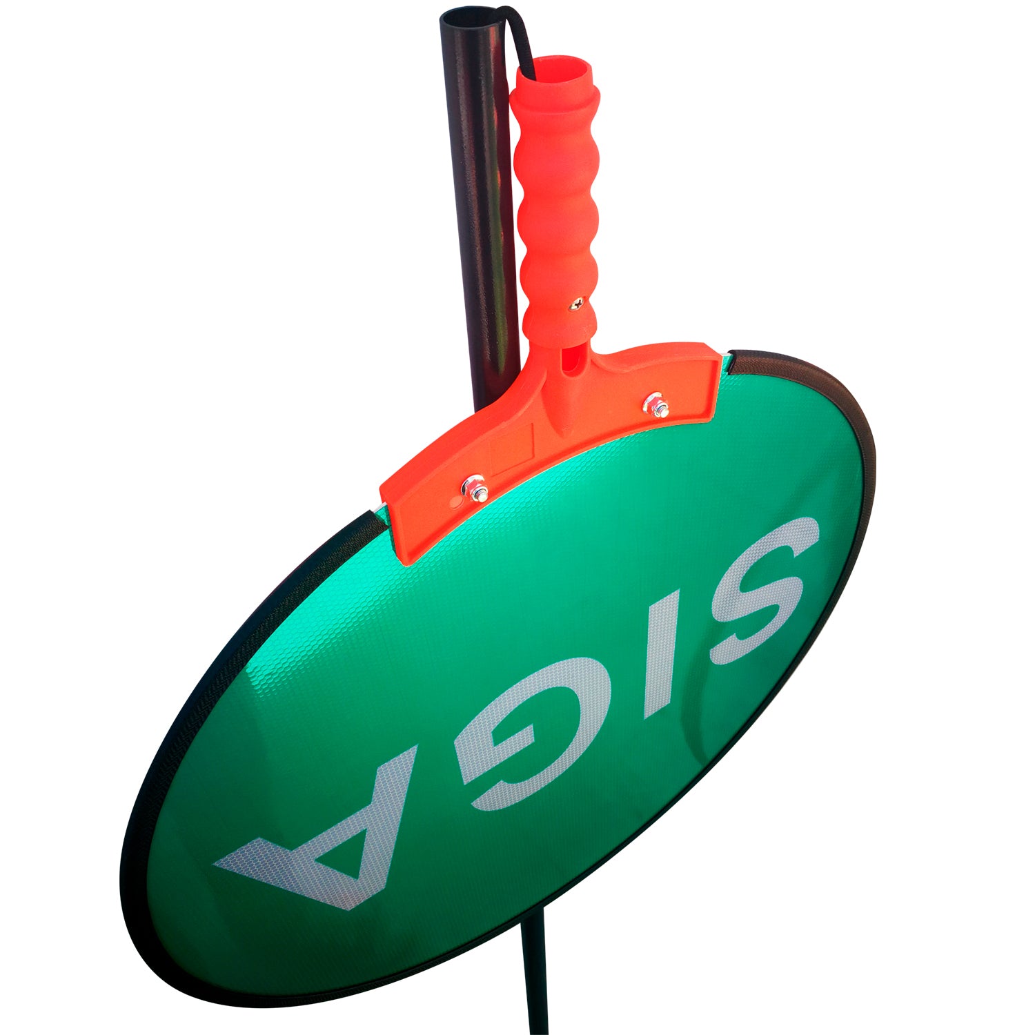 La parte superior proporciona un agarre cómodo para un uso prolongado. El poste es lo suficientemente largo como para que pueda descansar sobre el piso, mientras el letrero está a la altura logrando óptima visibilidad. Posee cable de sujeción para impedir que se desprenda de su posicón de trabajo. Material de paleta tan liviano que lo hace fácil y versátil de usar.