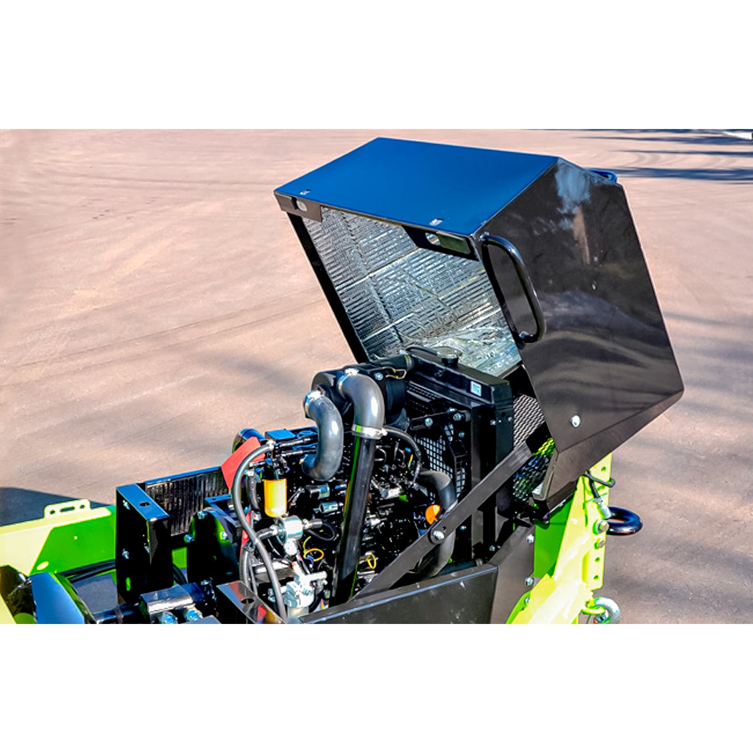 El motor ecológico a diésel trabaja lo más bajo posibles de RPM para la mejor combinación de rendimiento y economía de combustible. El silenciador para reducción de ruido combinado con la cobertura del motor (opción) con aislamiento reduce los niveles de ruido hasta un 40% en comparación con otros modelos.